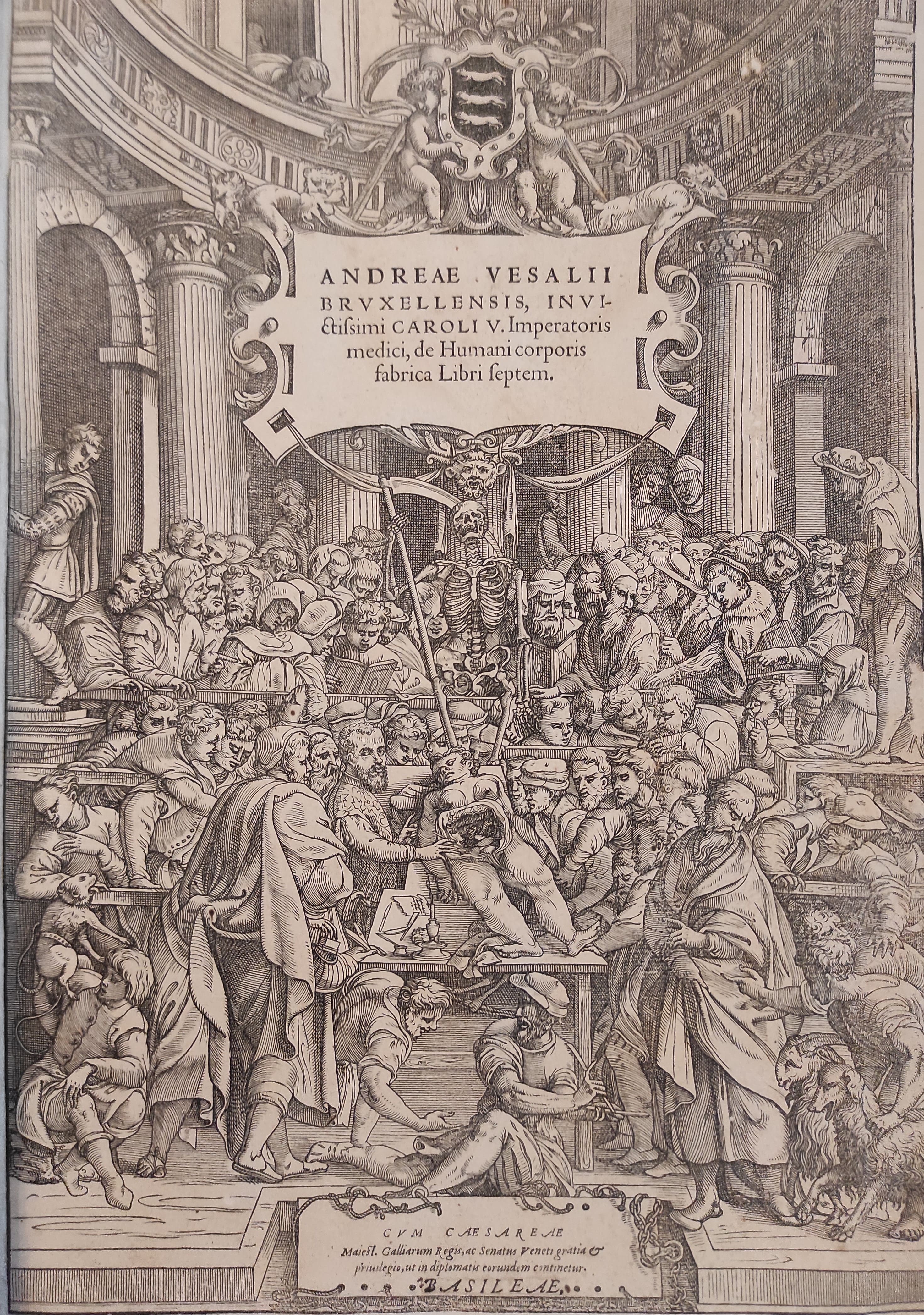 A tali dispute sembra ispirato il frontespizio illustrato della sua opera più famosa, il De humani corporis fabrica libri septem, stampata a Basilea nel 1543, dal tipografo e editore Johannes Oporinus. L’opera, in cui la bellezza estetica delle immagini si unisce all’importanza scientifica, è il risultato della critica puntigliosa dei testi anatomici galenici e dei galenisti, corretti da Vesalio grazie all'evidenza empirica raccolta nel corso delle numerose dissezioni che ebbe occasione di praticare e rappresenta una delle pietre miliari nella storia dell'editoria del Cinquecento.